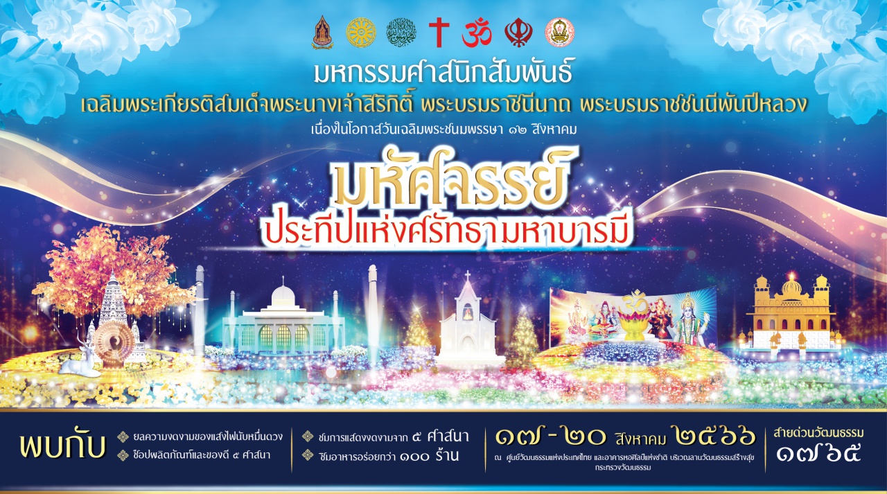 กระทรวงวัฒนธรรม โดยกรมการศาสนาร่วมกับองค์การทางศาสนา หน่วยงานภาครัฐและเอกชน จัดงานมหกรรมศาสนิกสัมพันธ์ สร้างสรรค์เศรษฐกิจและสังคม 2566 เฉลิมพระเกียรติสมเด็จพระนางเจ้าสิริกิติ์ฯ พระบรมราชชนนีพันปีหลวง ภายใต้แนวคิด “มหัศจรรย์ประทีปแห่งศรัทธามหาบารมี” รวมพลังศาสนิกชนทุกศาสนานำหลักธรรมสร้างความสมานฉันท์ นำ Soft Power ในมิติศาสนา สร้างงาน สร้างรายได้ให้กับชุมชน ในระหว่างวันที่ 17-20 สิงหาคม 2566 ณ ศูนย์วัฒนธรรมแห่งประเทศไทย อาคารหอศิลป์แห่งชาติ และลานวัฒนธรรมสร้างสุข กระทรวงวัฒนธรรม