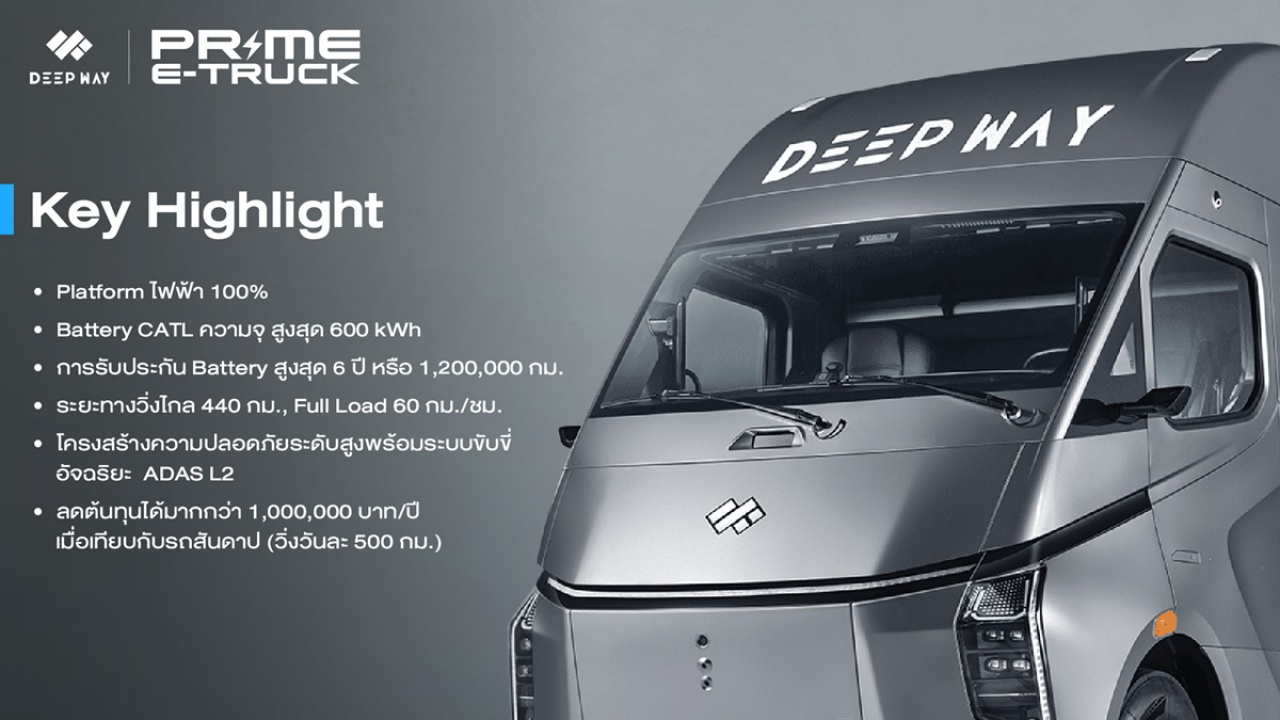 Mr. Tan Chang Yu ผู้ร่วมก่อตั้งและผู้บริหารสูงสุดฝ่ายวิศวกรรม ของ DeepWay กล่าวถึงความร่วมมือในครั้งนี้ว่า "ในฐานะที่ DeepWay เป็นบริษัทเทคโนโลยีรายแรกของโลกที่พัฒนาโซลูชันรถบรรทุกพลังงานไฟฟ้าอัจฉริยะด้วยแนวคิดการออกแบบและสร้างสรรค์ และสามารถผลิตเชิงพาณิชย์ในระดับอุตสาหกรรมได้จริง โดยมียอดส่งมอบสะสมแล้วกว่า 6,400 คันในประเทศจีน และกำลังก้าวสู่ช่วงเวลาสำคัญของการที่รถบรรทุกหนักพลังงานไฟฟ้าล้วนของ DeepWay ได้เข้าสู่ตลาดประเทศไทยอย่างเป็นทางการ ถือเป็นฐานยุทธศาสตร์ของเอเชียตะวันออกเฉียงใต้ ด้วยความร่วมมือกับ Prime E Truck ในฐานะผู้จัดจำหน่ายรถหัวลากไฟฟ้า DeepWay ในประเทศไทยครั้งนี้ เพื่อสร้างระบบนิเวศ 'รถ + บริการ' (Vehicle + Service) ที่สมบูรณ์สำหรับผู้ประกอบการโลจิสติกส์ไทย เพื่อรองรับการเปลี่ยนผ่านสู่การขนส่งสีเขียวในระยะยาว”