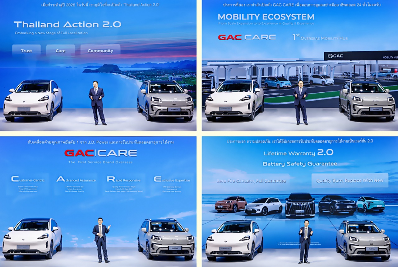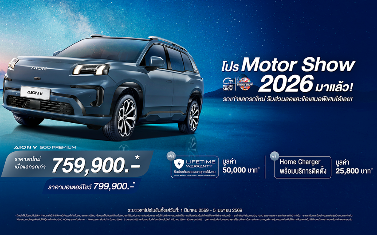 เมื่อวันที่ 23 มีนาคม 2569 GAC AION Thailand ประกาศความยิ่งใหญ่ในงาน Bangkok International Motor Show 2026 ขนทัพยนตรกรรมพลังงานทางเลือกใหม่จัดแสดงแบบเต็มพิกัด พร้อมไฮไลต์สำคัญถึง 3 ประการ ได้แก่ การเผยโฉมรถยนต์รุ่นใหม่ล่าสุด GAC AION V 500, การประกาศนโยบาย GAC CARE เพื่อยกระดับมาตรฐานการบริการหลังการขายแบบครบวงจร,และเปิดตัวโครงการ GAC Easy Trade-in, สะท้อนความมุ่งมั่นในการสร้างระบบนิเวศยานยนต์ไฟฟ้าที่สมบูรณ์แบบและยั่งยืนในประเทศไทย