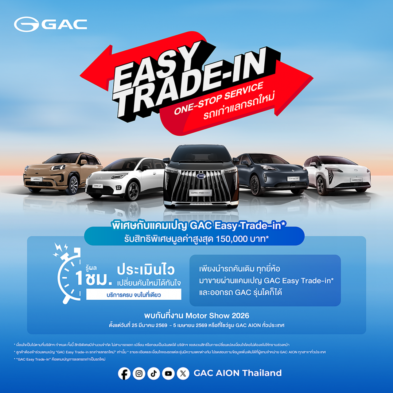 GAC AION Thailand มอบบริการแบบ One-Stop Service ทราบผลประเมินราคารถภายใน 1 ชม. และดำเนินการจบได้เร็วที่สุดภายในวันเดียว พร้อมรับส่วนลดพิเศษสูงสุด 150,000* เมื่อนำรถคันเดิมทุกยี่ห้อมาเทิร์นเพื่อออกรถ GAC รุ่นใหม่ ตั้งแต่วันที่ 25 มีนาคม 2569 – 5 เมษายน 2569