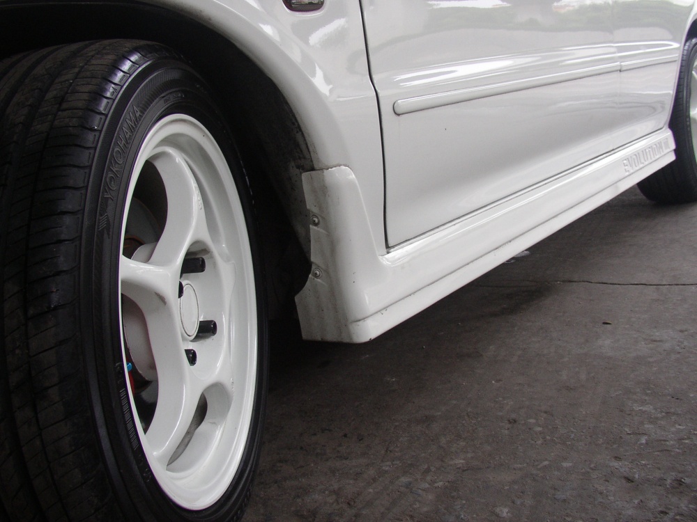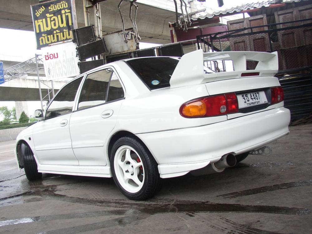 ส่วนสเกิร์ตข้างก็ต้องแนบของแท้ที่ปั๊มตัวนูน EVOLUTION III   ขยับมาใส่ล้อแม็กของ  ENKEI  RACING    ขอบ 16 นิ้วกว้าง  7 นิ้ว ในแบบ 5  ก้านโค้งสีขาว คู่กับยางคุณภาพนอก  YOKOHAMA    รุ่น dB decibel    ขนาด 205 /50R16   แต่ที่หลังคาได้ยกมาทั้งบานในแบบมีซันรูฟสามารถปรับได้หลายระดับ  ทางด้านหลังก็ได้ปรับแต่งกันชนหลังให้เป็นไปตามแบบของอีโว 3  โดยใต้กันชนมีท่อไอเสียสแตนเลสโผล่โชว์ให้เห็นนั้นเป็นของ  SITT TURBO  และในส่วนของด้านหลังนั้นแน่นอนต้องยกฝากระโปรงหลังมาพร้อมกับสปอยเลอร์ทรงสูงแบบที่มีไฟเบรคดวงที่สาม  ถึงจะดูครบเต็มตัว  จึงเสริมให้มุมมองด้านท้ายของรถดูเข้าท่าแล้ว