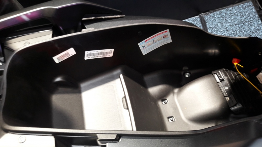พร้อมที่เก็บสัมภาระใต้เบาะขนาด 28 ลิตร แบ่งระดับสูงต่ำสามารถใส่หมวกกันน็อกแบบเต็มใบได้ แต่ถ้าเป็นหมวกกันน็อกไซส์ใหญ่อาจจะปิดเบาะไม่ได้ หรือจะเก็บสัมภาระทั่วไปได้อย่างเต็มที่ และยังเป็นที่เก็บของแบตเตอรี่ที่มีฝาปิดอย่างเรียบร้อย ทำให้เวลาเซอร์วิสเปลี่ยนแบตเตอรี่ทำได้ง่าย พร้อมภายในใต้เบาะยังเป็นเก็บถุงเครืองมืออีกด้วย