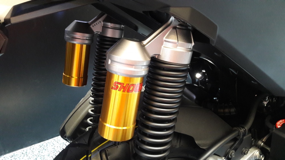 New ADV150 จุดเด่นของรถรุ่นนี้เห็นจะเป็นระบบกันสะเทือนหลังแบบทวินซับแท็งก์คู่จากแบรนด์ Showa ซึ่งเป็นเทคโนโลยีจากสนามแข่ง มาในแบบกระบอกสีทองให้สวยเท่อย่างมีสไตล์ แต่ไม่สามารถปรับระดับนุ่มนวลได้ ซึ่งจะช่วยดูดซับแรงกระแทกได้เร็วและนุ่มนวลกว่า เวลาที่ต้องขี่ผ่านเนินต่าง ๆ หรือลูกระนาดที่ขวางทาง แถมยังให้การยึดเกาะถนนที่ดีอีกด้วย ตอบโจทย์การใช้งานบนสภาพถนนทุกรูปแบบทั้งในเมืองและนอกเมือง