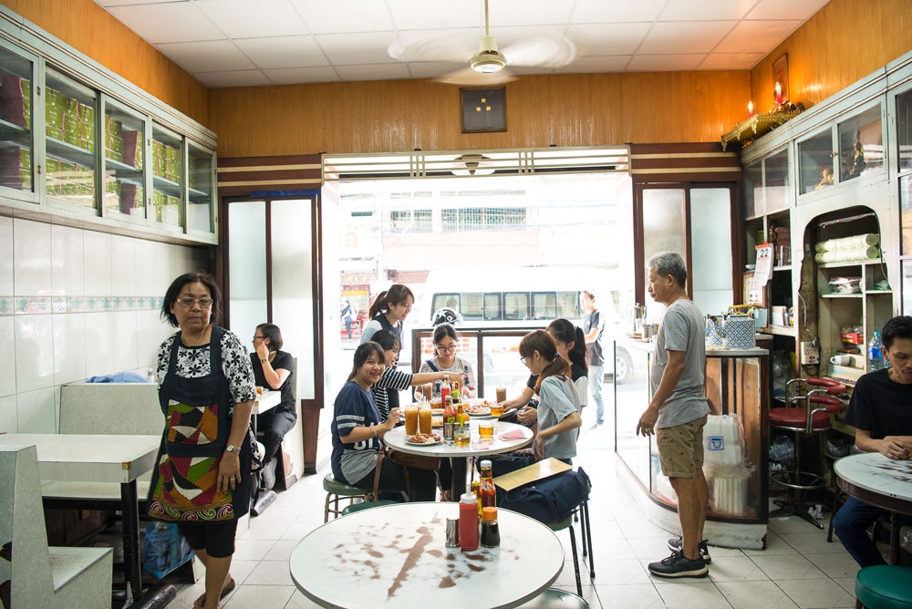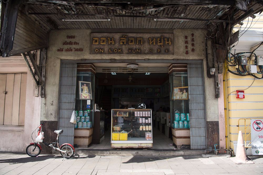 ประเดิมที่แรกกับอดีตของวันวานที่ ร้าน ออน ล๊อก หยุ่น ลักษณะเป็นตึกแถวเก่าแก่ คูหาเดียว 2 ชั้น ตั้งอยู่บนถนนเจริญกรุงใกล้ศูนย์การค้า ดิโอลด์ สยาม พลาซ่า เปิดบริการมานานกว่า 70 ปี เป็นร้านกาแฟที่บริการอาหารเช้าแบบฝรั่งหรือ American breakfast ที่เราคุ้นหูคุ้นตาตามสถานที่พักแรมต่างๆ แต่ยังคงเอกลักษณ์ย่านคนจีนสมัยก่อน มีบริการเสิร์ฟน้ำชาร้อนฟรีให้ลูกค้าที่สั่งอาหาร และสามารถขอเพิ่มได้ตลอดตามต้องการ รูปแบบการจัดวางอาหารเรียบง่ายไม่ได้พิถีพิถันตามแบบฝรั่ง ยังคงบรรยากาศสบายๆ เป็นกันเอง และราคาอาหารไม่แพง