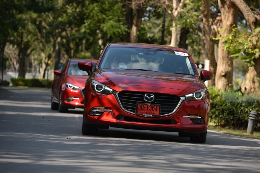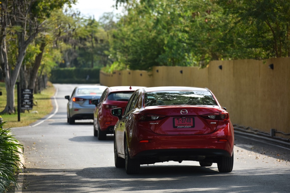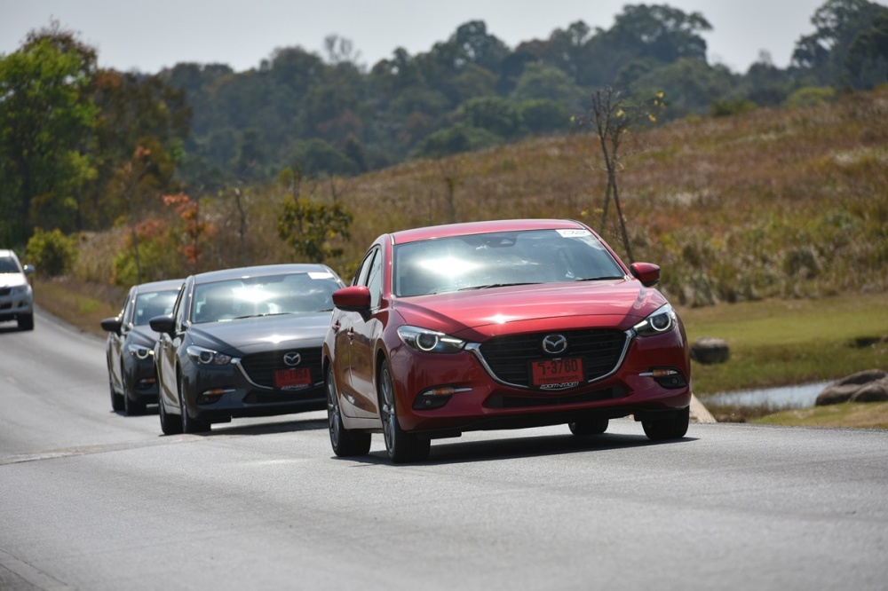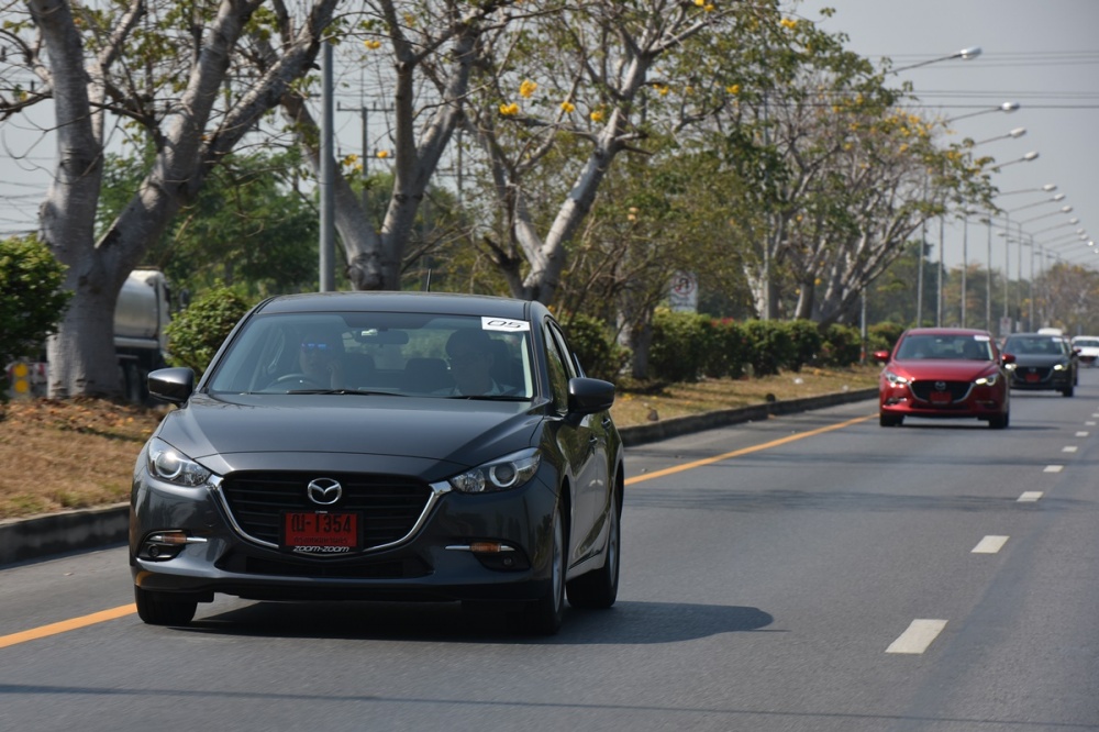 ในการทดสอบรถ New Mazda 3 มีให้ได้ขับทั้งรุ่นซีดานและรุ่นแฮทช์แบ็ค โดยเลือกใช้เส้นทางกรุงเทพฯ –เขาใหญ่ นครราชสีมา ซึ่งมีระยะทางไปกลับประมาณ 400 กว่ากม. และในรถแต่ละคันจะมีผู้ทดสอบรถจำนวน 3 คน ทำให้ได้รับรู้ถึงสมรรถนะการทดสอบที่ไม่ต่างจากขับรถใช้งานทั่วไป เพราะในรถคันหนึ่งมีผู้โดยสารรวมกับคนขับเป็น 3 คนจัดว่ากำลังดี และพอดีรุ่นนี้พกขุมพลังเครื่องขนาด 2000 ซีซี.จึงทำไปได้แบบสบาย ๆ สามารถตอบสนองอัตราเร่งได้อย่างต่อเนื่อง จะสปีดแซงรถคันอื่นทำได้ทันใจ ที่สำคัญช่วงล่างเซ็ทมาเพื่อรองรับให้ขับสนุกยิ่งขึ้น