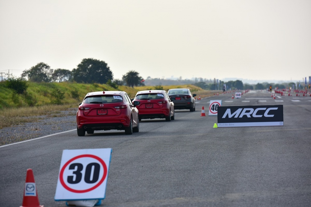 จากนั้นได้มาทดสอบระบบ MRCC หรือ Mazda Radar Cruise Control ที่ช่วยปรับความเร็วตามคันหน้าโดยอัตโนมัติ เพียงแค่ตั้งความเร็วที่ต้องการไว้ และไม่ต้องเหยียบคันเร่ง จากนั้นรถจะคอยตรวจสอบระยะห่างระหว่างคันหน้าอยู่ตลอดเวลา หากรถคันหน้าชะลอช้าลง ระบบ MRCC ก็จะสั่งให้ชะลอความเร็วตามคันหน้าด้วยเช่นกัน แต่ถ้ารถคันหน้าชะลอความเร็วลงต่ำกว่าประมาณ 20-25 กม./ชม. ระบบ MRCC จะตัดการทำงานออกไปอัตโนมัติพร้อมสัญญาณแจ้งเตือนบนหน้าปัด